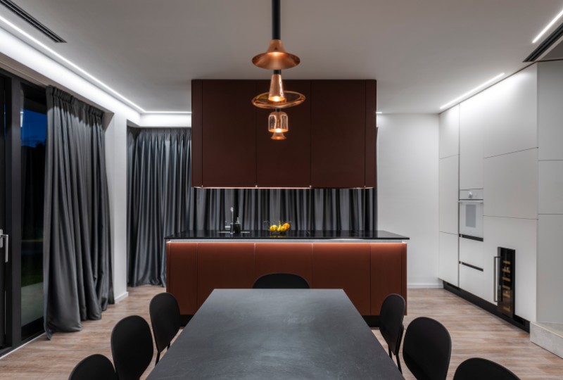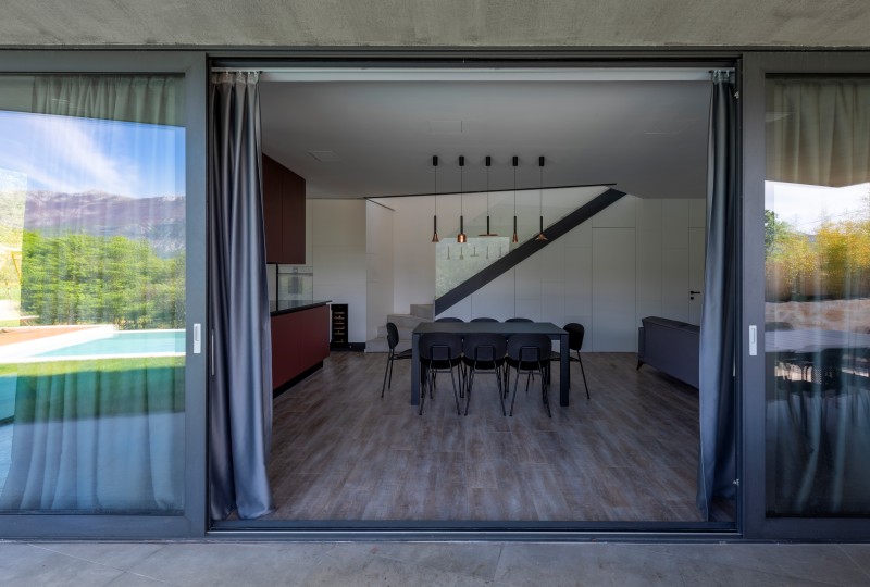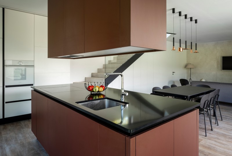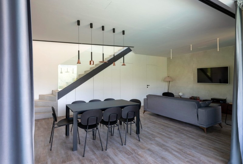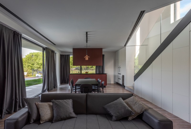 U prizemlju je smješten moderan dnevni boravak s prostranom kuhinjom kojom dominira kuhinjski otok upečatljive boje. Osim malog toaleta, ispod stubišta nalaze se i skriveni ormari s ostavom i praonicom. Isprekidana igra linija između ormara i vrata daje jedan diskretan ali karakteran štih cjelokupnom prizemlju.